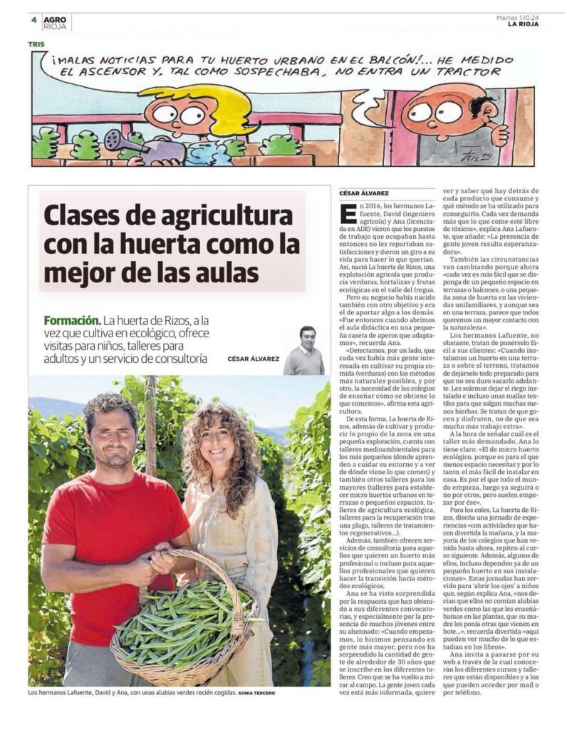 Periódico La Rioja 01/10/2024 Gracias al periódico La Rioja y a César Álvarez por hablar de nuestra labor formativa: actividades para colegios, talleres, visitas, montaje de huertos y asesoramiento.